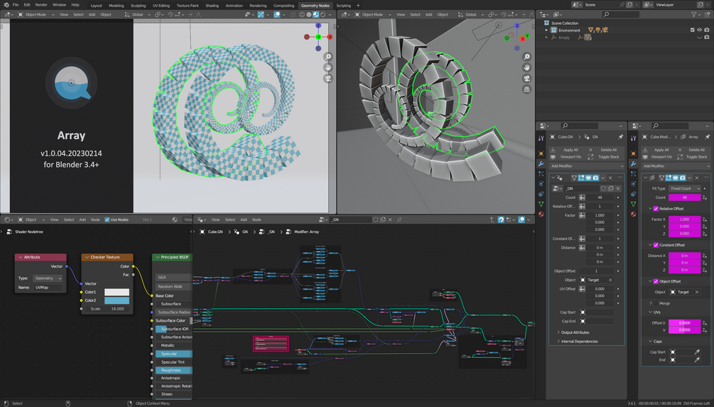 This node group fills that gap, and provides an (almost complete) replication of the Array Modifier based on Geometry Nodes.